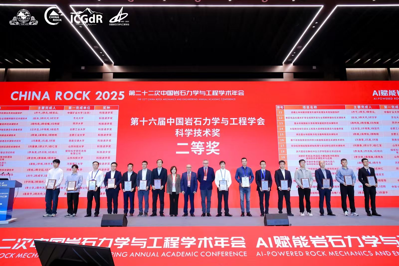 10月18日,CHINAROCK2025第二十二次中国岩石力学与工程学术年会在河北雄安隆重召开。会议期间,中国岩石力学与工程学会举行了2025年科学技术奖颁奖仪式,我校作为第一完成单位,304AM永利集团李文帅员工主持完成的“深部矿井采动-构造应力叠加致冲机理及高效防控关键技术与应用”项目获科技进步二等奖、黄娜老师作为主要完成人完成的“岩质隧道地震动灾变理论及吸能减震设计方法”项目获自然科学二等奖。
