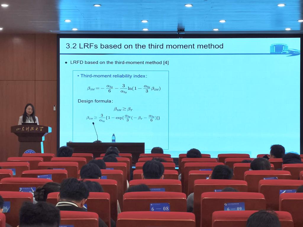 讲坛伊始,李佩佩介绍了基于可靠度的荷载与抗力系数设计方法(LRFD),她指出,该方法为基于可靠性的极限状态设计提供了一个合理的框架,但它涉及设计点识别和复杂的双重迭代计算,在实际工程应用中显得较为繁琐。为解决这一难题,她提出了利用三力矩变换来确定载荷与抗力系数的方法,她强调,该方法无需基于导数的迭代,也不依赖于随机变量的完整概率分布,此外,它在广泛的指定可靠性指标上都能达到足够的准确性,为实际的一阶可靠性方法(LRFD)应用提供了一种高效且便捷的替代方案。师生们围绕新方法在复杂工程结构中的适用性、可能性等问题踊跃提问,报告人逐一进行了细致解答,现场交流气氛热烈,深入而富有成效。