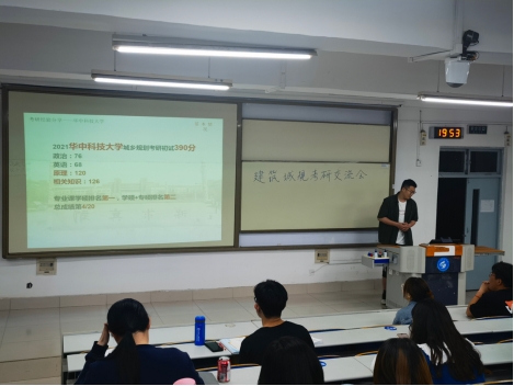 建筑学2016-1班高洁,已保研至华中科技大学,她介绍了16级保研情况以及如何拿到保研名额、怎样准备保研材料和笔试、面试的经验;随后,城乡规划2016级张庆昊,已考研至华中科技大学,他结合自身经历分享了各院校的考研难度、目标院校的确立及自己每日的考研时间表;建筑学2016-1班王勇,已考研至哈尔滨工业大学,他重点介绍了哈工大的考研内容、考研计划安排以及备考过程中应该注意的事项;建筑2016-2班李几凡,已被浙江大学录取,他重点从考研心态上鼓励同学们自信考研,放平心态,已积极的心态备考。最后,建筑2016-2班商海祥,分享了自己成功考入大连理工大学的心得体会,她强调要形成自己的考研方法,从快题专业课方面给大家分享了自己的经验。