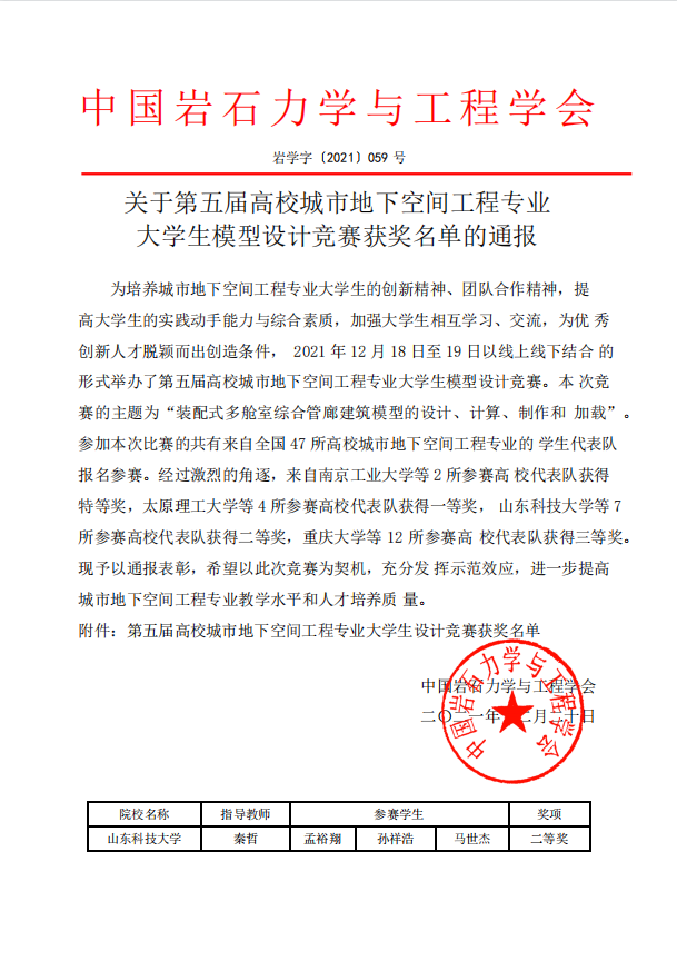2021年12月18日至19日,第五届高校城市地下空间工程专业大员工模型设计竞赛以线上线下结合的方式成功举办。该竞赛由中国岩石力学与工程学会主办的全国性专业技能大赛。由304AM永利集团城空与岩土专业本科生组成的304AM永利集团团队荣获全国二等奖。