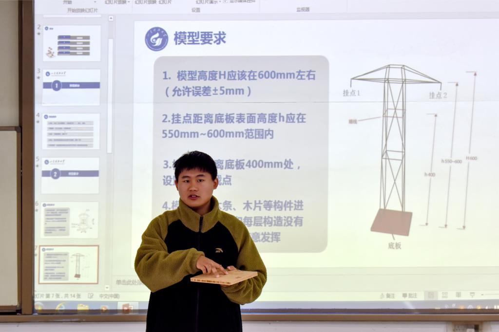 在答疑会上,胡阳从赛题解读、模型要求、模型检测以及模型加载四个方面进行了讲解,详细说明此次比赛对模型搭建材料和整体外观尺寸的要求,并公布模型竖直静载和水平静载的加载及评分标准。在提问答疑环节,参赛选手们积极参与、认真记录并且主动提出问题。会议结束后,进行了比赛相关材料的发放。
