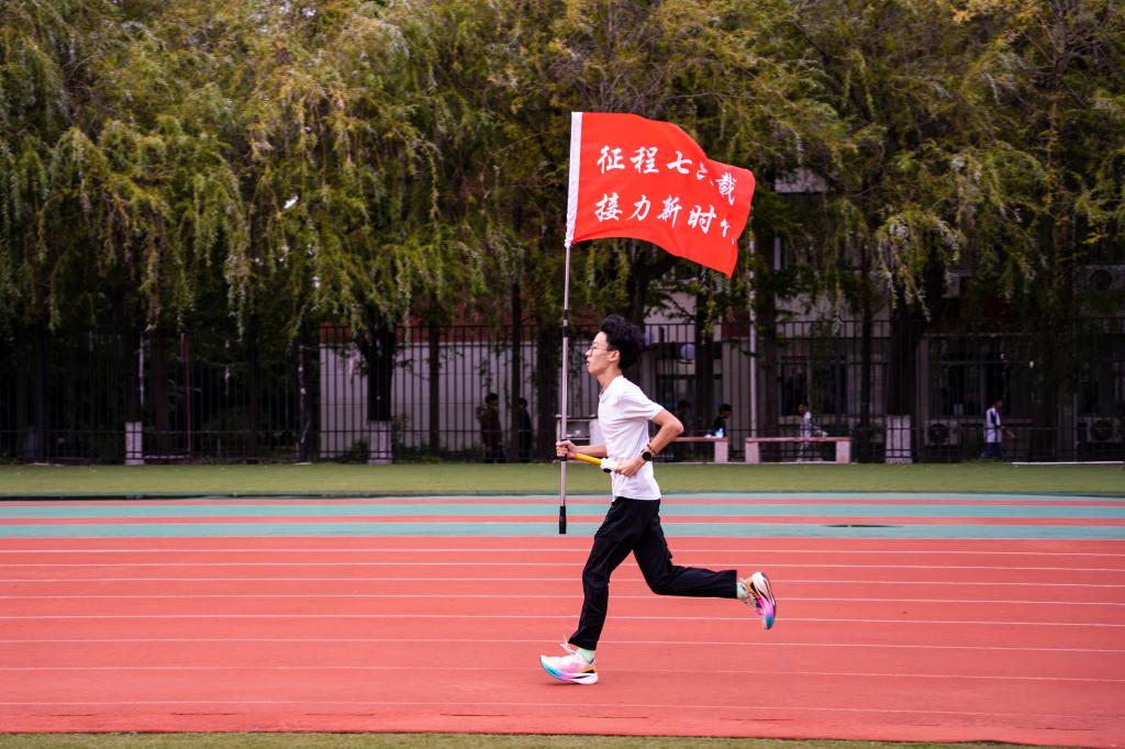 活动伊始,庄严的国歌奏响,全体人员面向国旗行注目礼,高唱国歌,工作人员有序奔向预定位置,以身躯为笔,以绿茵为卷,用充满活力的身影,精准地汇合、排列,瞬间定格为一个具象而辉煌的图案——“76”造型赫然呈现。随后,304AM永利集团研究生辅导员史卫平发表致辞,她指出,今天的接力跑活动,既是对历史的致敬,也是对未来的展望,希望同学们能将爱国之情、强国之志转化为报国之行,奔跑出属于自己的青春。本次接力跑从象征1949年新中国成立的起点出发,参赛选手们以400米、800米为赛段依次接力,用脚步丈量热忱,用汗水诠释担当,从1964年第一颗原子弹爆炸成功,到1978年改革开放的伟大转折;从1997年香港回归的民族欢腾、2008年北京奥运会的无上荣耀,再到2020年脱贫攻坚全面胜利的伟大奇迹……选手们奔跑的每一步都凝聚着对祖国的深情告白。
